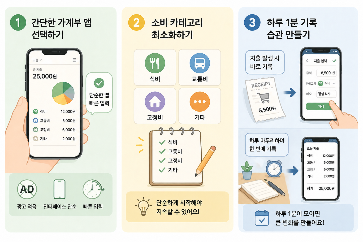 처음부터 기능이 많은 앱을 선택하면 오히려 사용하기 어려워집니다. 광고가 적고 인터페이스가 단순한 무료 앱을 선택하는 것이 중요합니다. 중요한 기준은 ‘빠르게 입력할 수 있는가’입니다.
