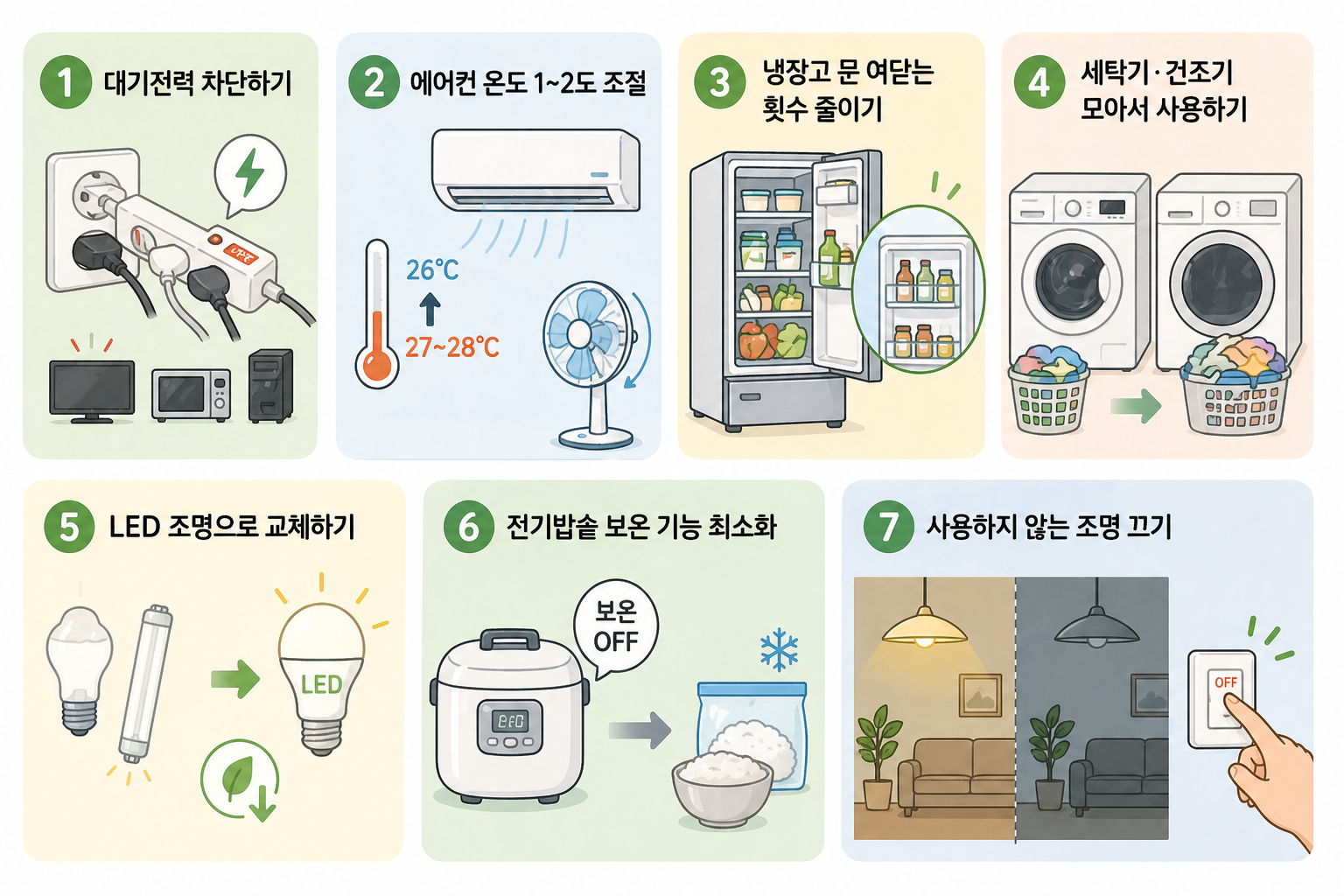 이 방법들을 모두 실천하지 않더라도, 2~3가지만 꾸준히 적용해도 전기요금이 줄어드는 것을 체감할 수 있습니다. 특히 대기전력 차단과 에어컨 사용 습관만 바꿔도 한 달 전기세 차이가 확실하게 나타납니다. 저 역시 이 두 가지만 실천했는데도 이전보다 부담이 눈에 띄게 줄었습니다.